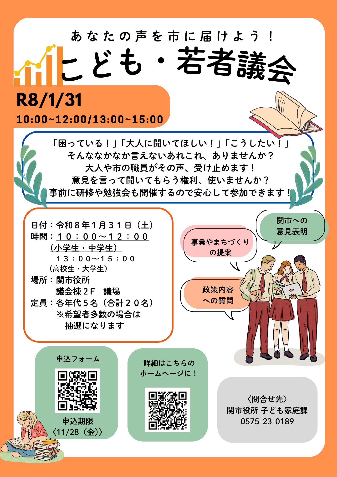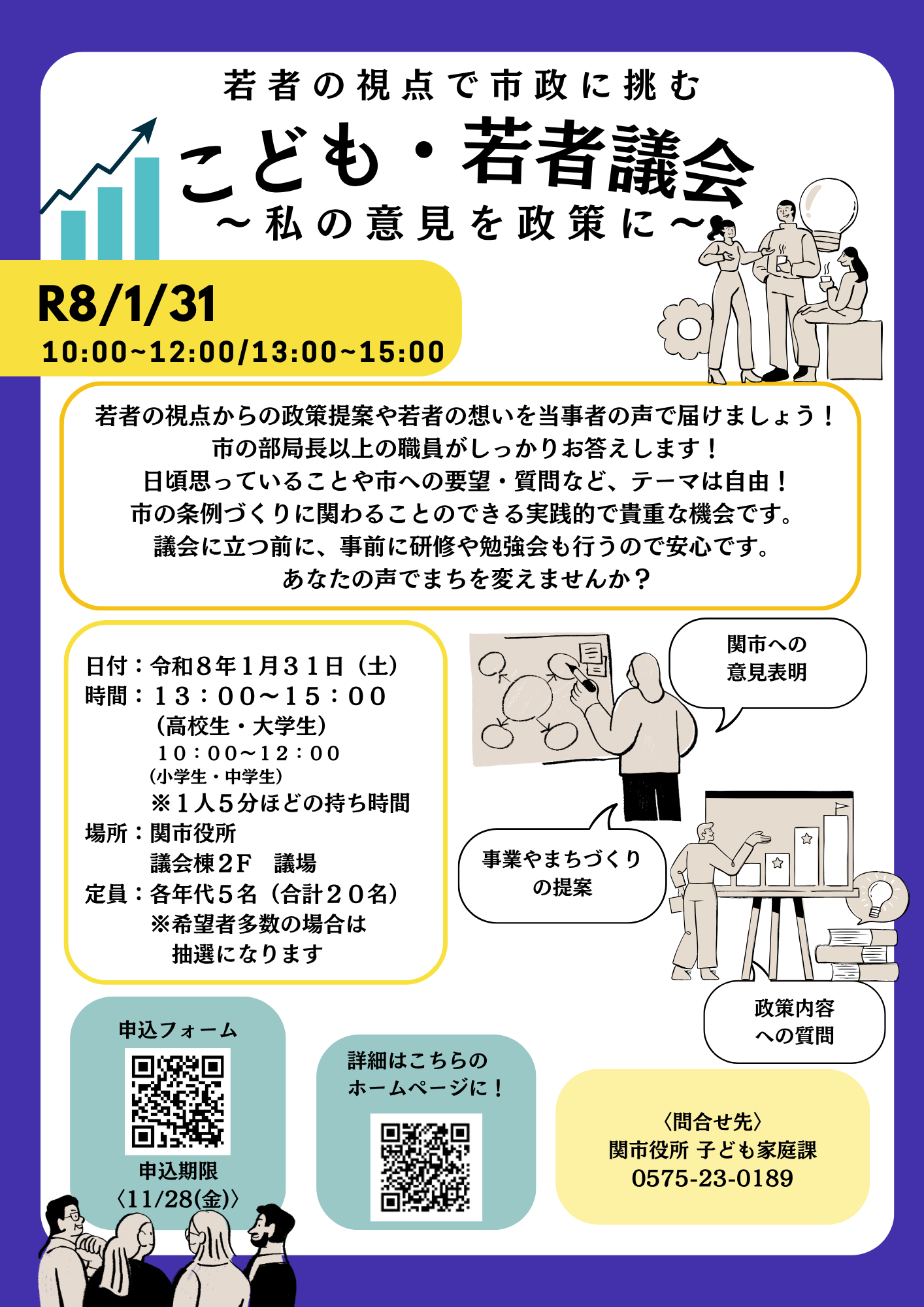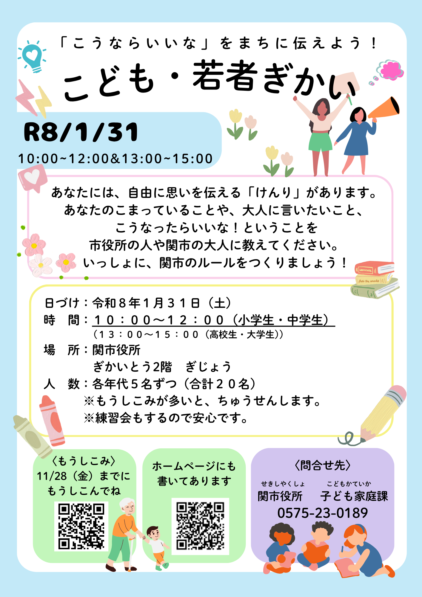 関市在住または関市在学の高校生・大学生の皆さんと一緒に、生活の中にある「こども・若者の権利」について考え、話し合います。若者の皆さんの思いを形にし、市民共通の思いとして、また、未来のこどもたちの希望のために一緒に考えましょう!