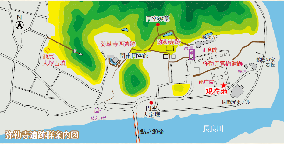 弥勒寺遺跡群には、弥勒寺官衙遺跡<現在地>、弥勒寺跡、弥勒寺西遺跡、池尻大塚古墳の4つの遺跡があり、それぞれ別の役割を持っています。