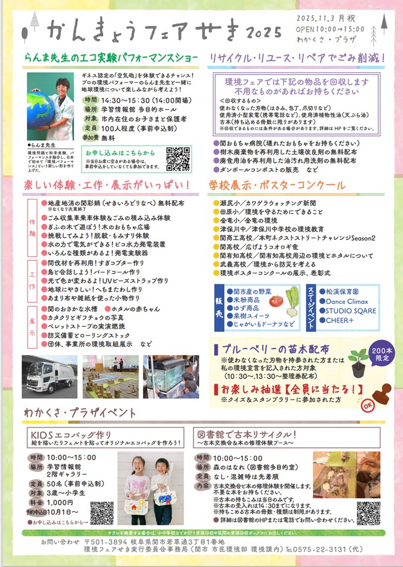 環境に関する活動を行っている団体や企業、学校などが、体験や工作、展示を行う「環境フェアせき2025~地球にやさしい くらしの選択~」を開催します。