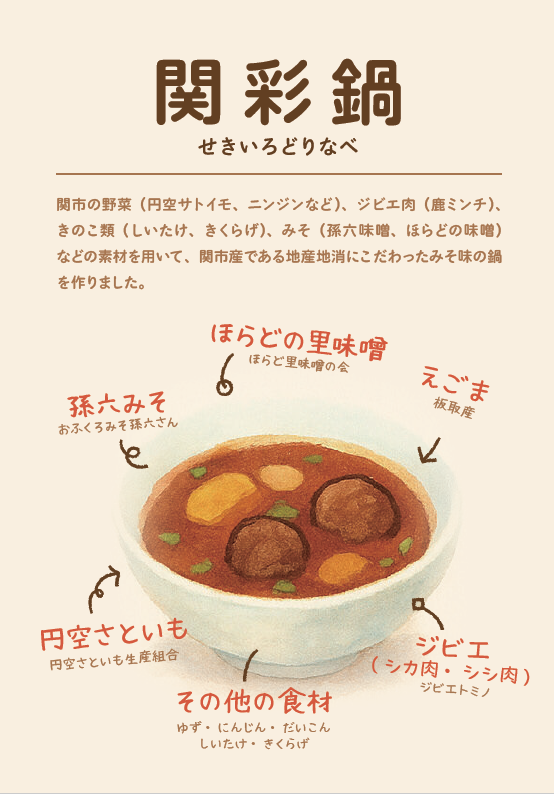 円空さといもなどの関市の野菜、鹿のジビエ肉(鹿ミンチ)、きのこ類(しいたけ、きくらげ)、みそ(孫六味噌、ほらどの里味噌)などの素材を使った「関彩鍋(せきいろどりなべ)」を無料で配布します。