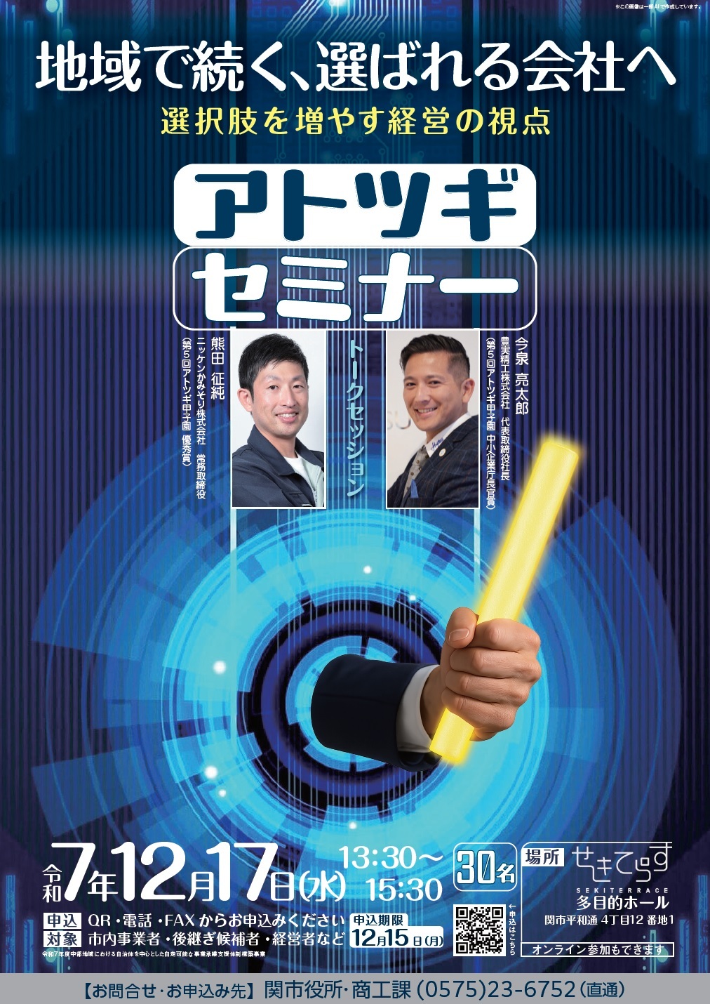 中小企業庁が主催する、全国各地の中小企業・小規模事業者の後継者による、既存の経営資源を活かした新規事業アイデアを競うピッチイベント「アトツギ甲子園」のファイナリストのお二人によるトークセッションを中心としたアトツギセミナーを開催します。