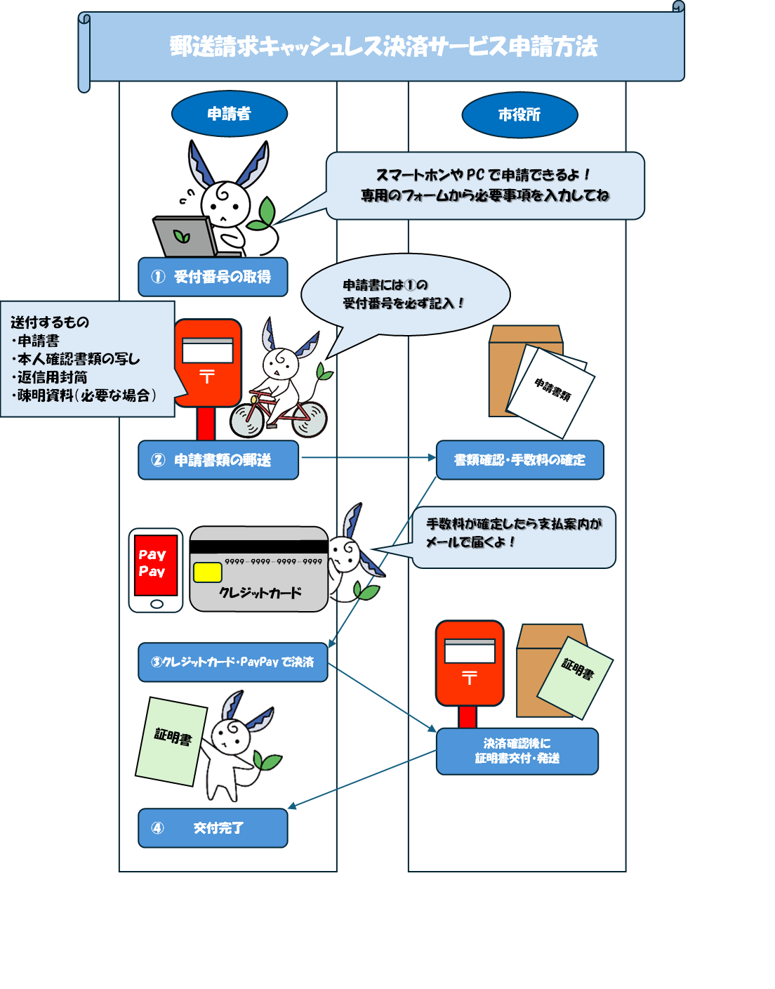 住民票の写し、戸籍の証明書など郵送請求の手数料支払いにクレジットカード決済・PayPay決済が利用できる、郵送請求キャッシュレス決済サービスを開始しました。このサービスを利用する場合、交付手数料のための定額小為替等の購入・送付は不要です。