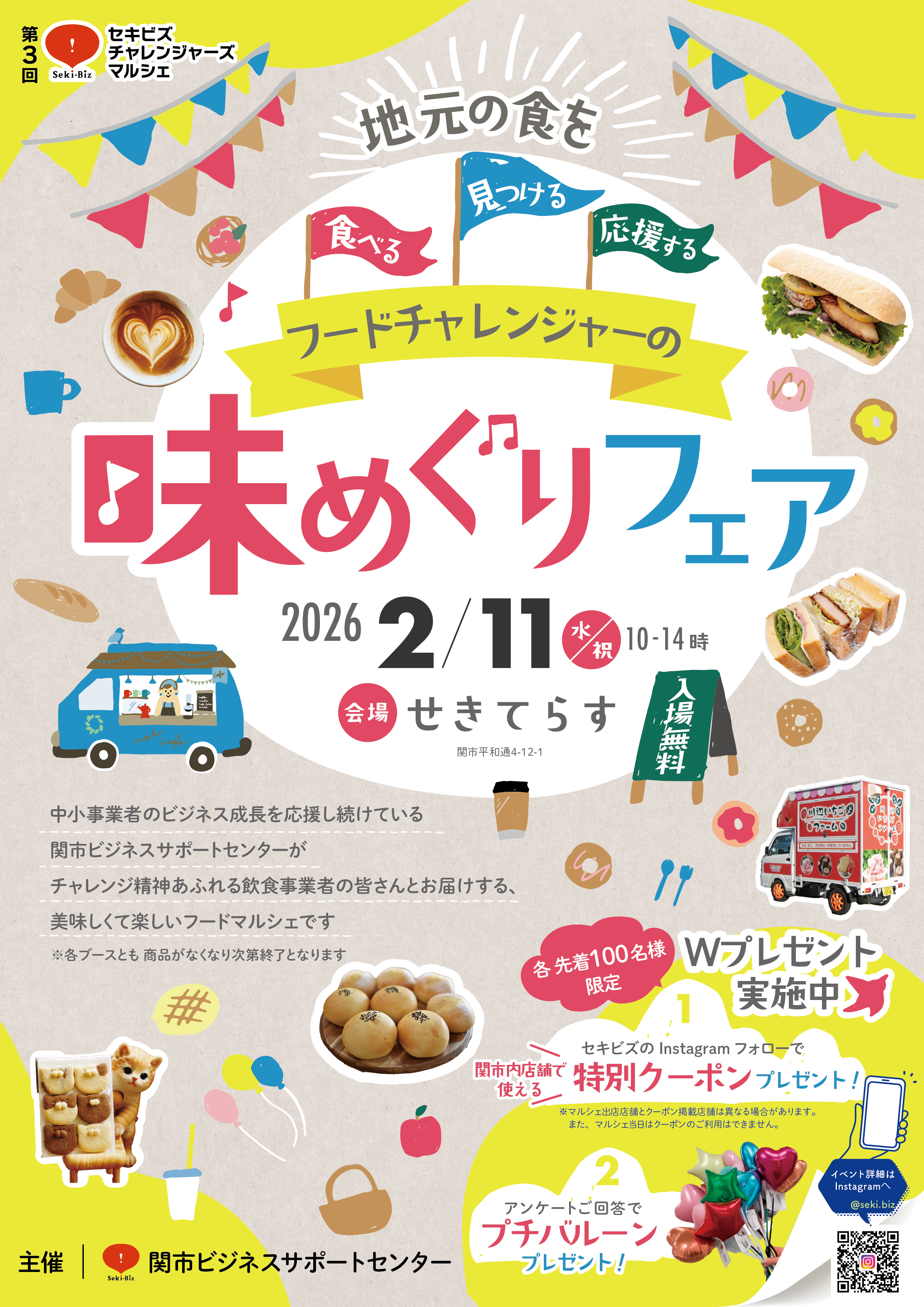 総勢23店舗のフードチャレンジャーが屋外・多目的ホール・刃物工房の3会場でお待ちしています!さらに、先着100名限定で、セキビズのインスタグラムアカウントをフォローすると、関市内の対象店舗で使用できる特別クーポンをプレゼント!