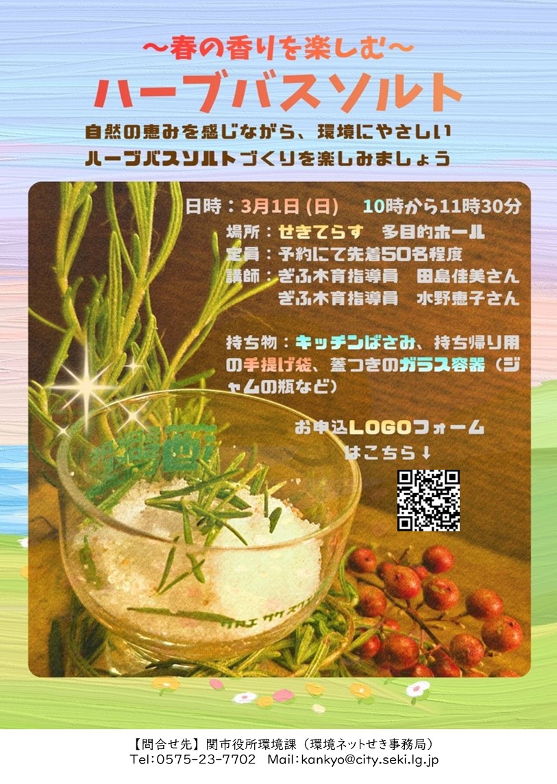 環境ネットせき 環境講座「〜春の香りを楽しむ〜ハーブのバスソルト作り」の参加者を募集します