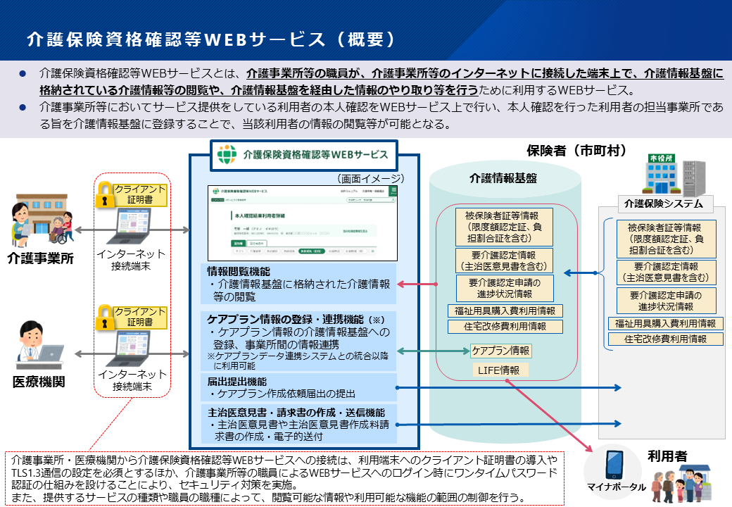 介護保険資格確認等WEBサービス(介護WEBサービス)とは、介護事業所等の職員がインターネット上に接続した端末上で、介護情報基盤内にある介護情報等の閲覧や情報のやり取り等を行うために利用するWEBサービス