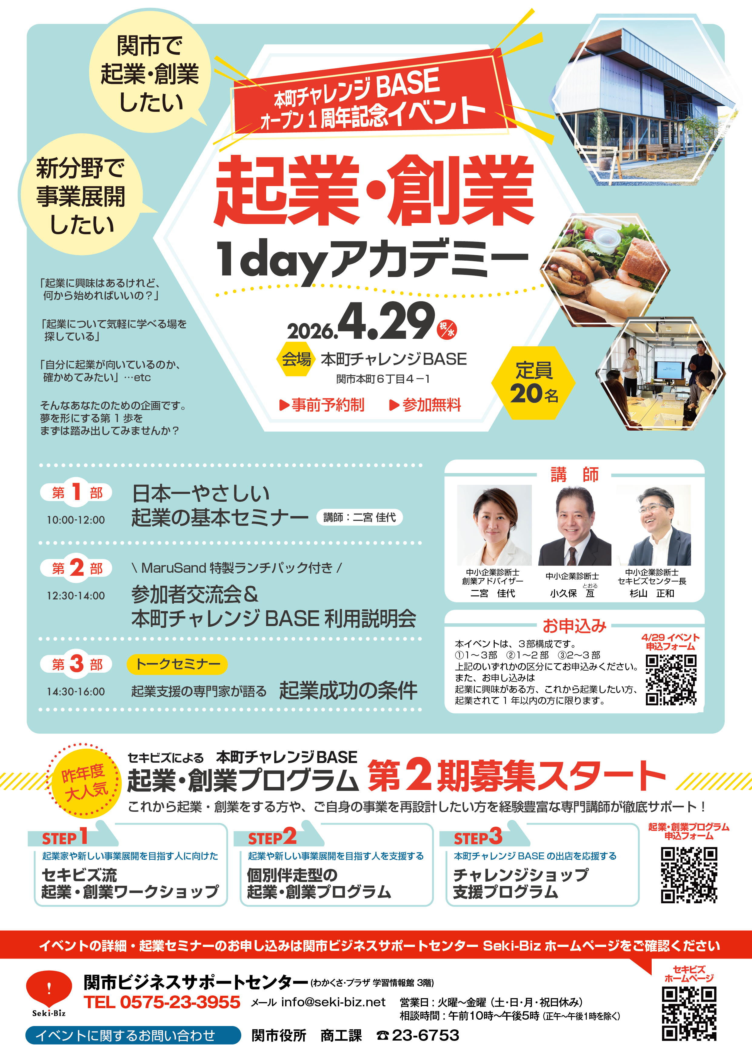 本町チャレンジBASEのリニューアルオープン1周年を記念するイベントとして「起業・創業1dayアカデミー」を開催します。日本一やさしい起業の基本セミナーや本町チャレンジBASEの使い方説明会、専門家トークセミナーなど1日参加するだけで関市での起業・創業へのチャレンジがグッと身近に感じられるプログラムが盛りだくさんです。